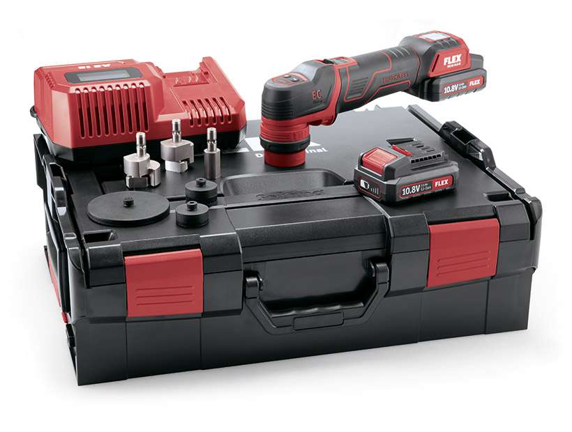 Akku-Kompaktpolierer mit werkzeuglosem Schnellwechselsystem für rotatives oder exzentrisch freilaufendes Arbeiten mit 3 bzw. 12 mm Hub. Einsetzbar für Spot Repair, Blütenschliff und Detailing. Perfekte Ergonomie und hohe Laufruhe durch Vibrationsoptimierung. Mit Gasgebeschalter, Drehzahlkonstanthaltung und 4 Drehzahlstufen, Anzeige durch LEDs gut erkennbar. FLEX Akku-System: Betrieb mit allen 10,8 V Akkupacks. Lieferumfang: • 1 PXE 80 10.8-EC • 1 Adapter rotativ DT-P • 1 Adapter exzentrisch 3 mm Hub DT-XF 3 • 1 Adapter exzentrisch 12 mm Hub DT-XF 12 • 1 Klett-Teller Ø 30 mm BP-M D30 PXE • 1 Klebe-Teller Ø 30 mm BP-M/SR D30 PXE • 1 Klett-Teller Ø 75 mm BP-M D75 PXE • 2 Akkus 2.5 Ah AP 10.8/2.5 • 1 Ladegerät CA 10.8/18.0 • 1 L-BOXX® 136